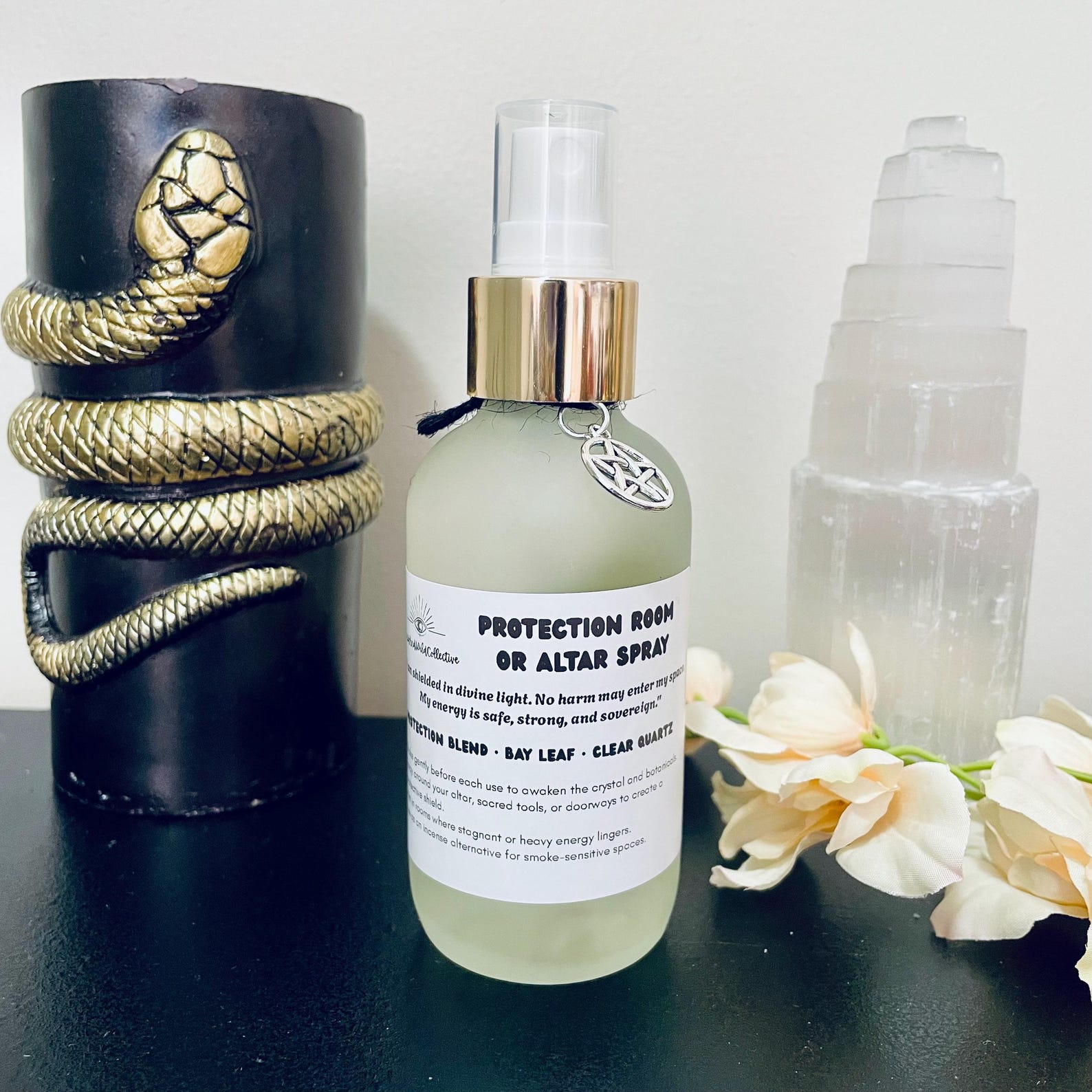 Clear and protect your sacred space with our 4oz Protection Spray – a smoke-free alternative to incense. Handcrafted with a Protection Oil Blend, Bay Leaf, and Clear Quartz in an alcohol base, this spray creates a powerful energetic shield while leaving behind the grounding scent of resins and woods. Solution itself is clear, not colored.