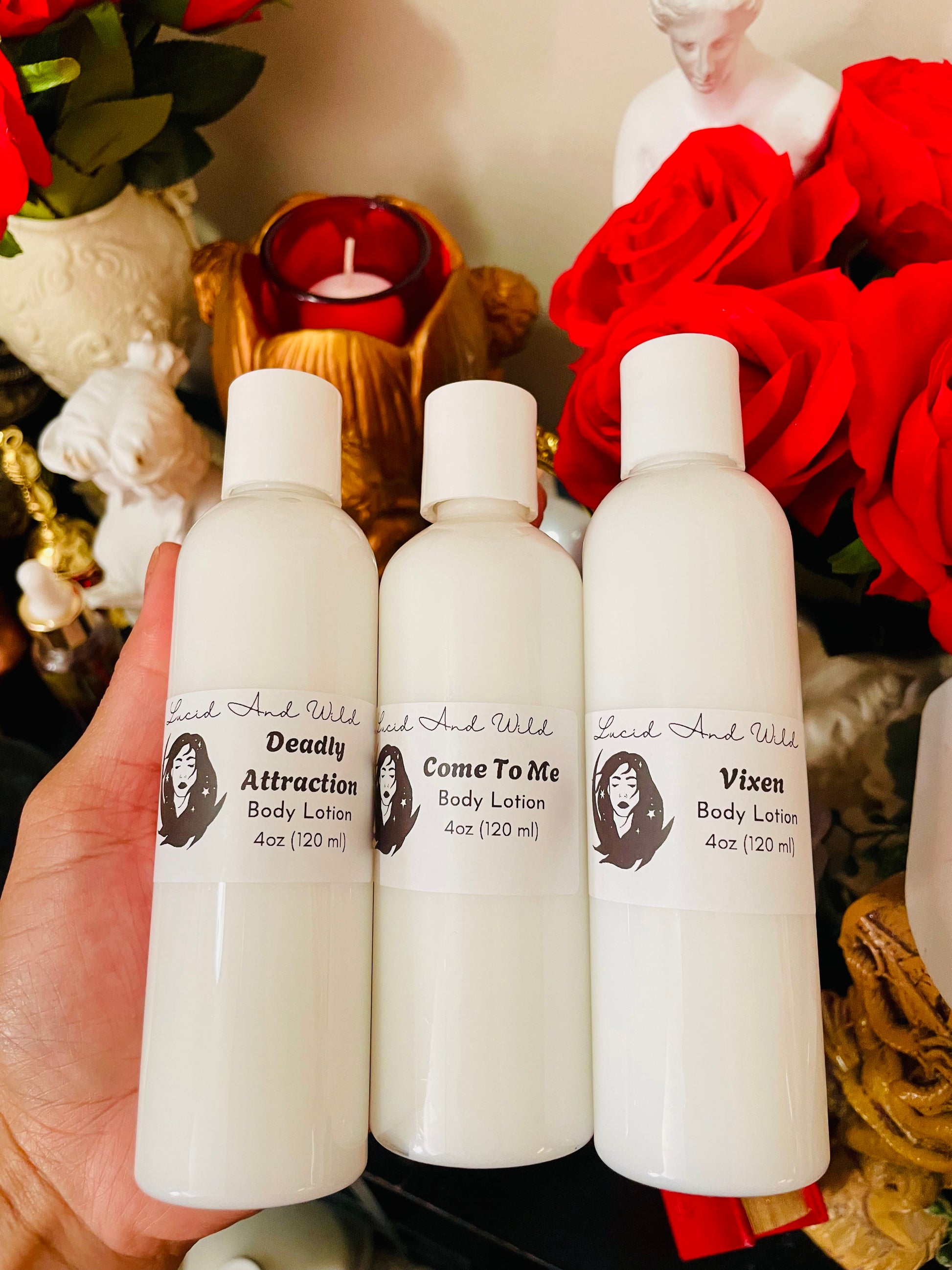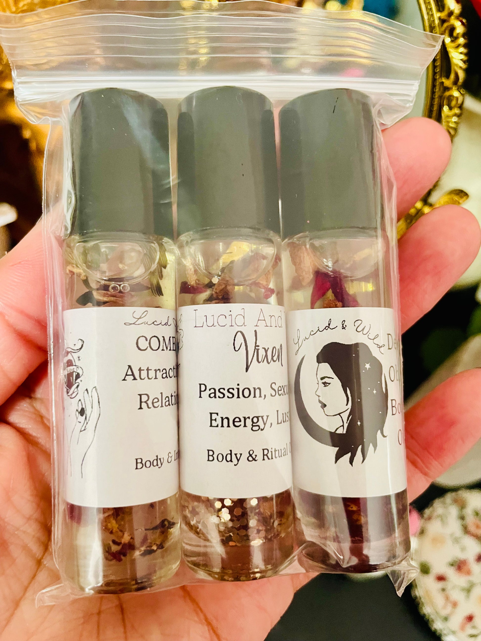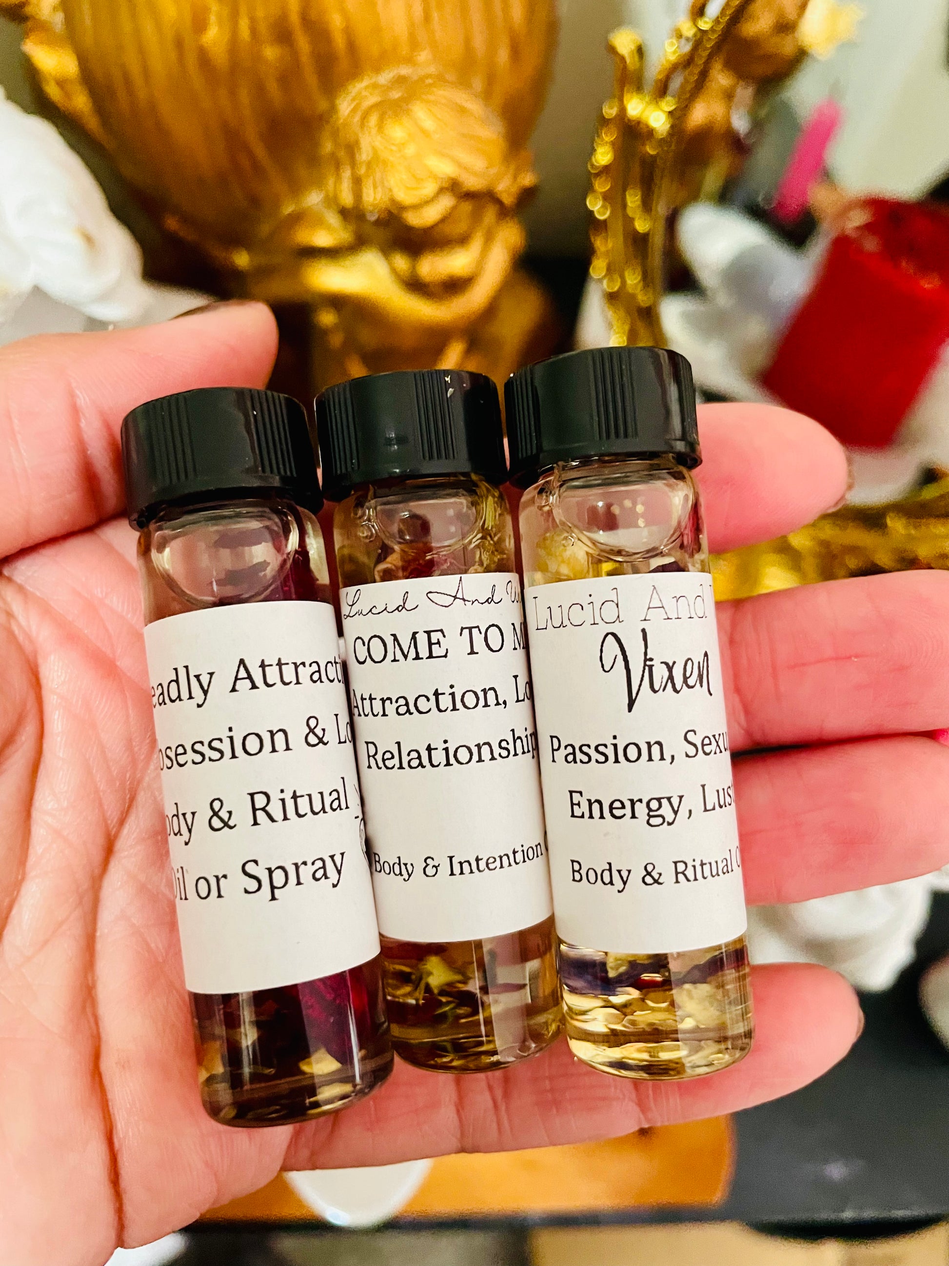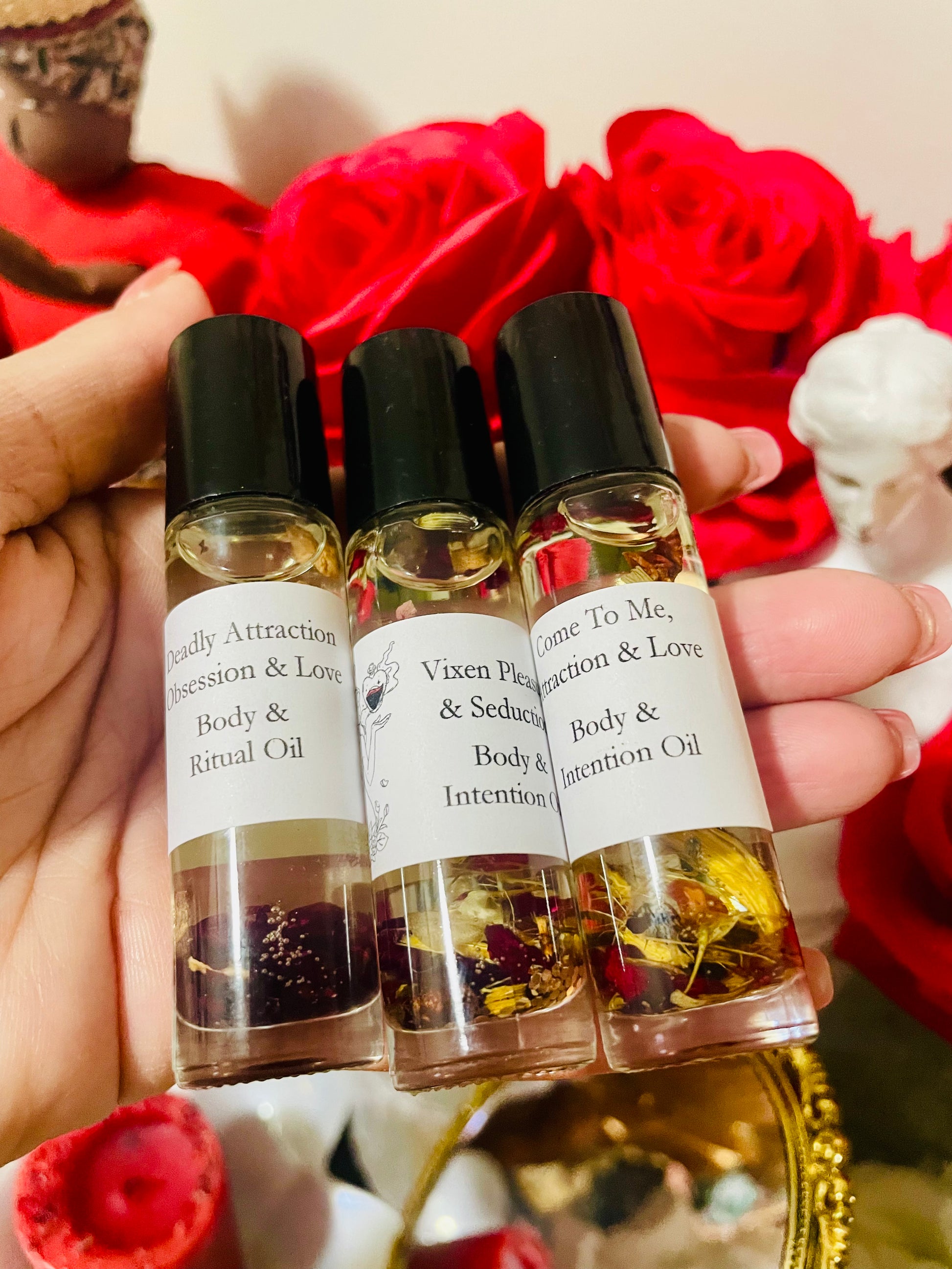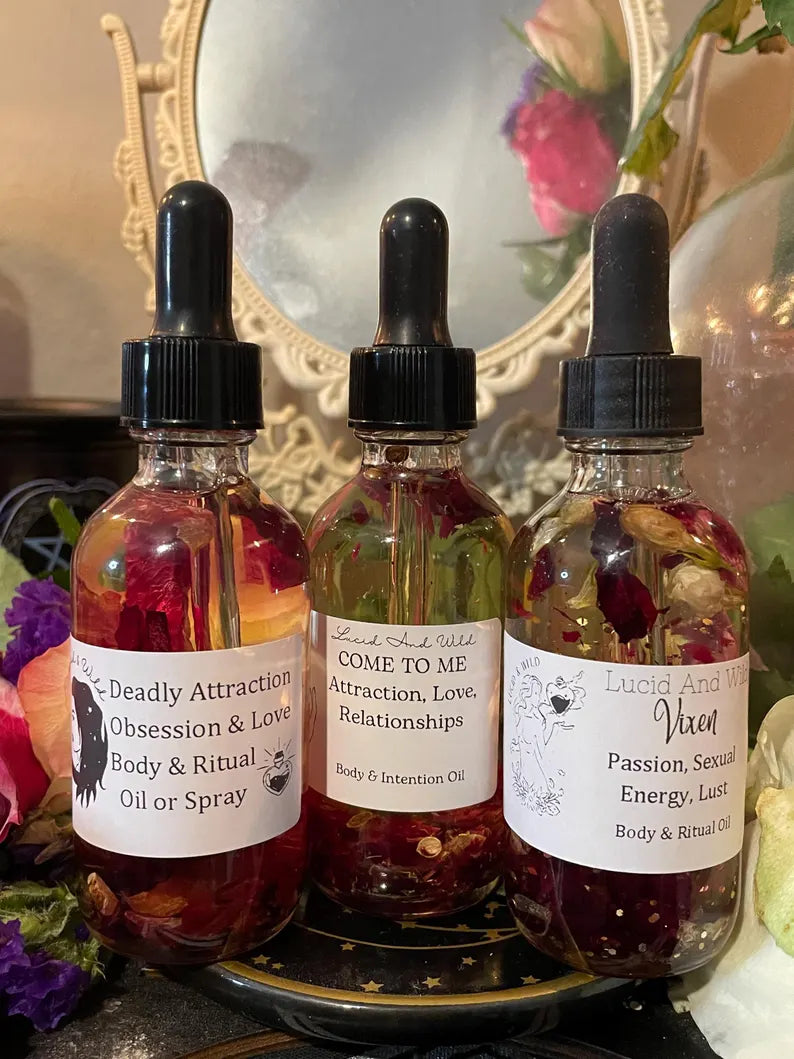 This listing is for a trio of attraction oils: Attraction, Come to me (Attraction & Love), Vixen Oil. Sprays, lotions, scrubs, and salts do not contain, herbs, colors or flowers. Please purchase actual oil blends for that.