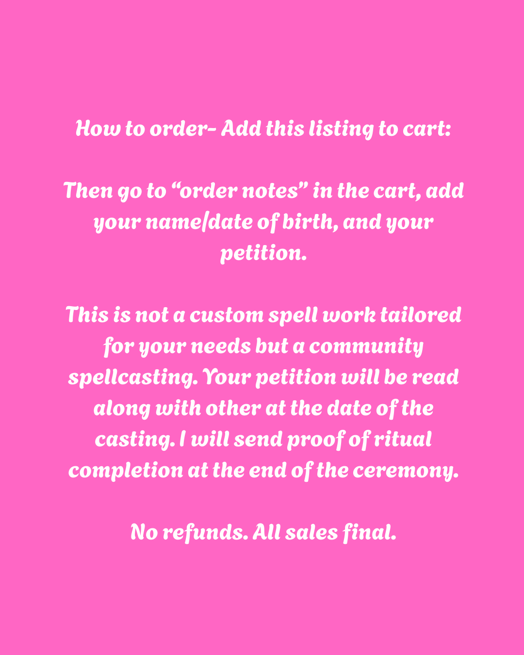 After the ritual, all participants will receive a photo/video of the altar and spell setup to the email used at checkout.