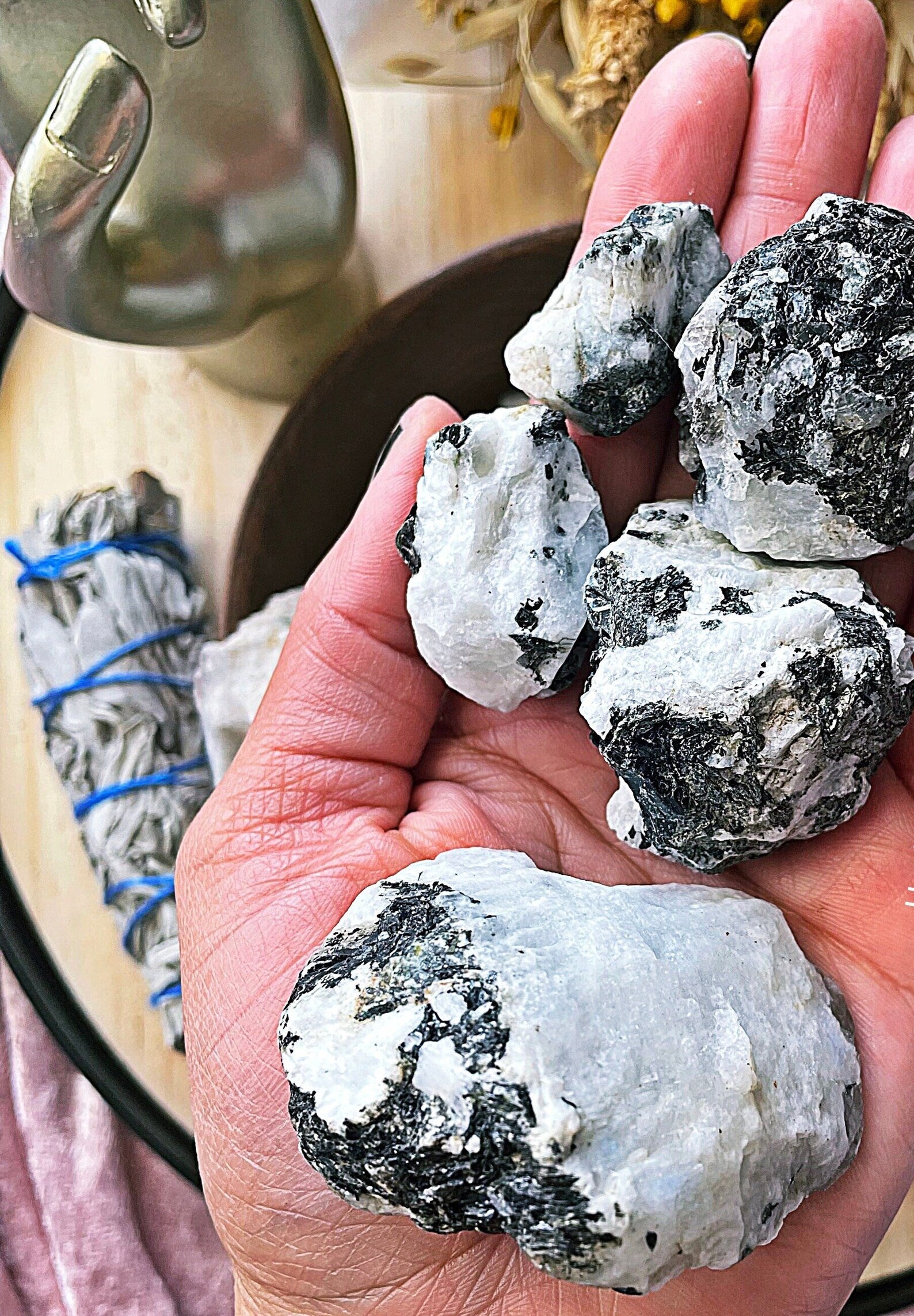 Moonstone can be used for meditation, divine feminine energy, intuition, boost vibrations, psychic abilities, clears energy, protection, sleep.
